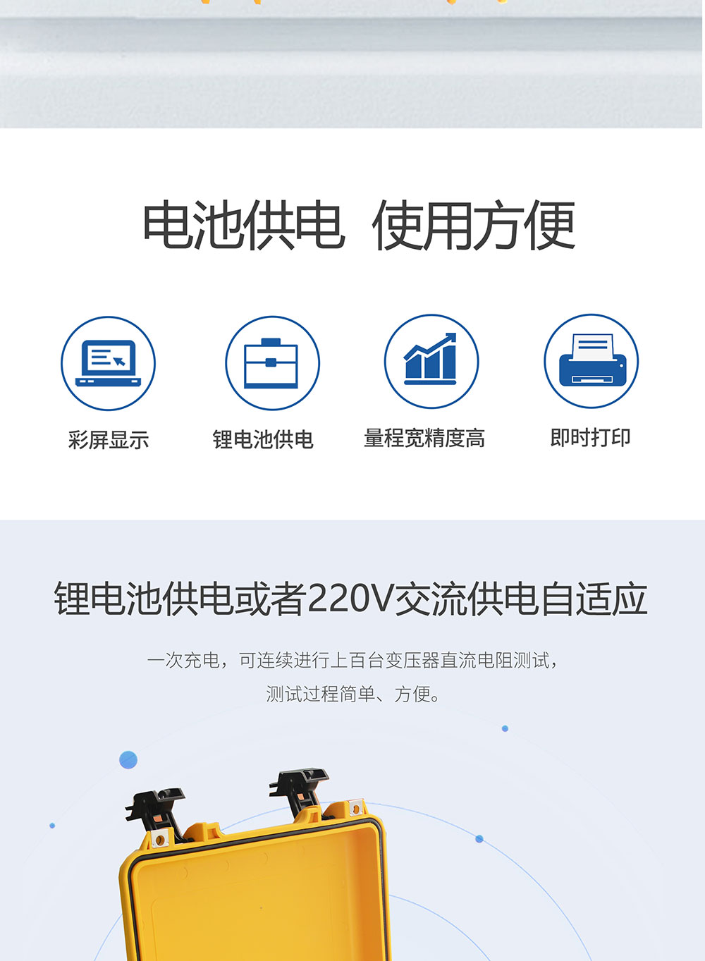 1、鋰電池供電或者220V交流供電自適應,一次充電,可連續進行上百臺變壓器直流電阻測試,測試過程簡單、方便。